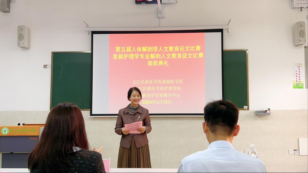为表彰在人体解剖学人文教育论文比赛及护理学专业解剖人文教育征文比赛中获奖的员工,进一步推进右医学子学习与传承医学精神,3月15日下午,第五届人体解剖学人文教育论文比赛暨首届护理学专业解剖人文教育征文比赛颁奖典礼在百东校区守正楼C201隆重举行。公司党委书记宾晓芸教授、护理公司教学科科长吕辉副教授、人体解剖学实验教学中心主任黄秀峰教授、人体解剖学实验教学中心全体老师以及本次竞赛获奖员工参加颁奖典礼,颁奖典礼由杨益东老师主持。