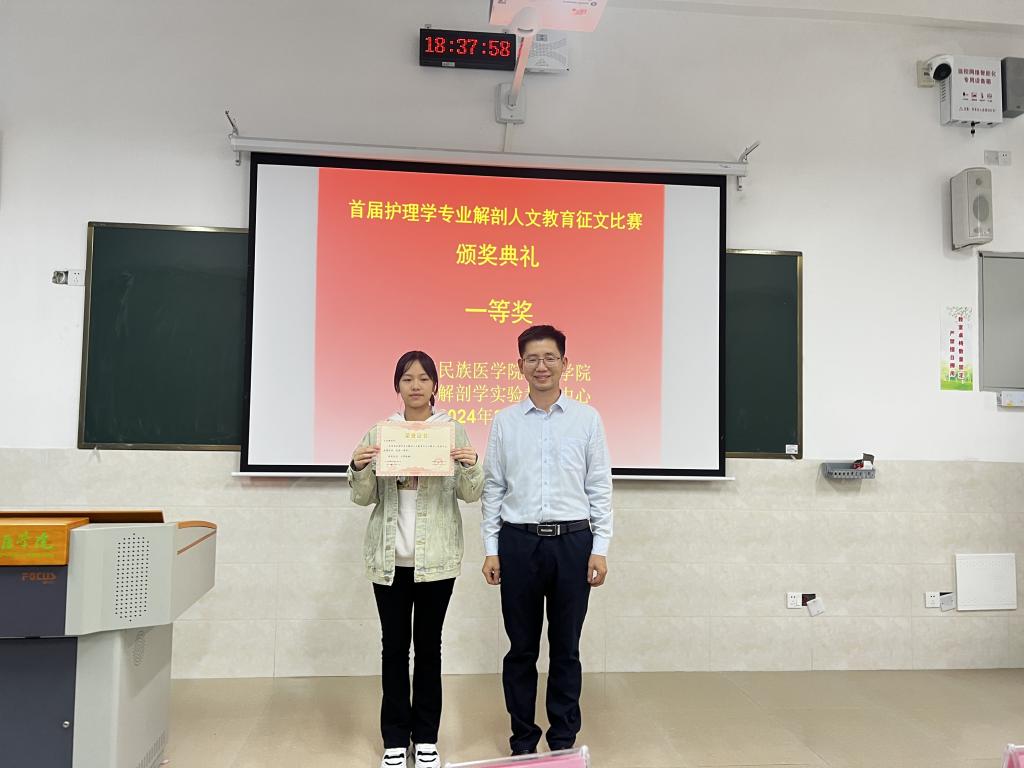 公司党委书记宾晓芸教授宣读第五届人体解剖学人文教育论文获奖名单,由出席颁奖典礼的老师分别为刘星宇等18位获奖同学颁奖。