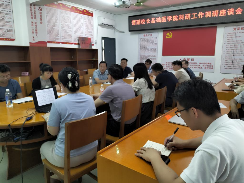 4月19日下午,公司党委常委、副董事长谭盛葵在科技处处长黄忠仕的陪同下到太阳成tyc33455cc开展科研工作调研,太阳成tyc33455cc党委书记宾晓芸,经理黄衍强,基础医学各二级学科、学术带头人参加了调研座谈会。