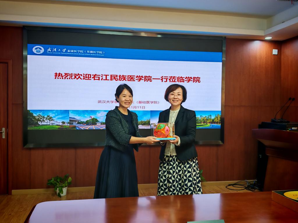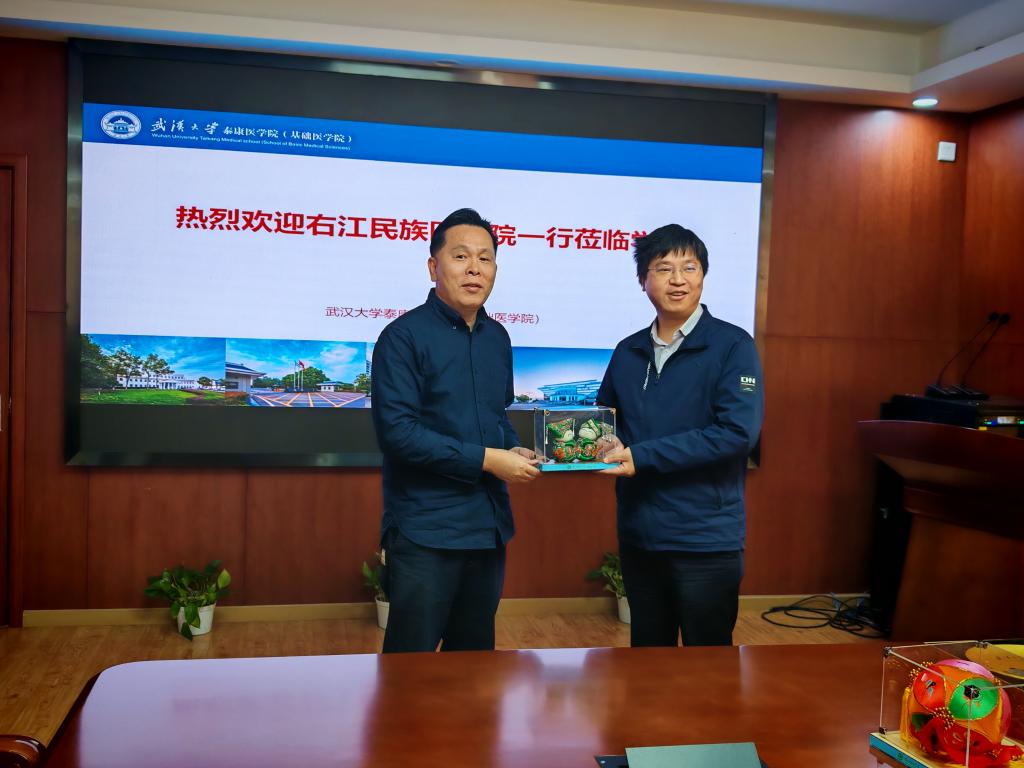 座谈会的最后,双方领导还互赠了礼物,太阳成tyc33455cc向武汉大学基础医公司赠送了广西绣球和壮族吉祥物麽乜,以表达此次学习交流的诚挚情谊;太阳成tyc33455cc则回赠了太阳成tyc33455cc官网武汉大学建筑风光玻璃盘,寓意着两校之间的友谊长存。