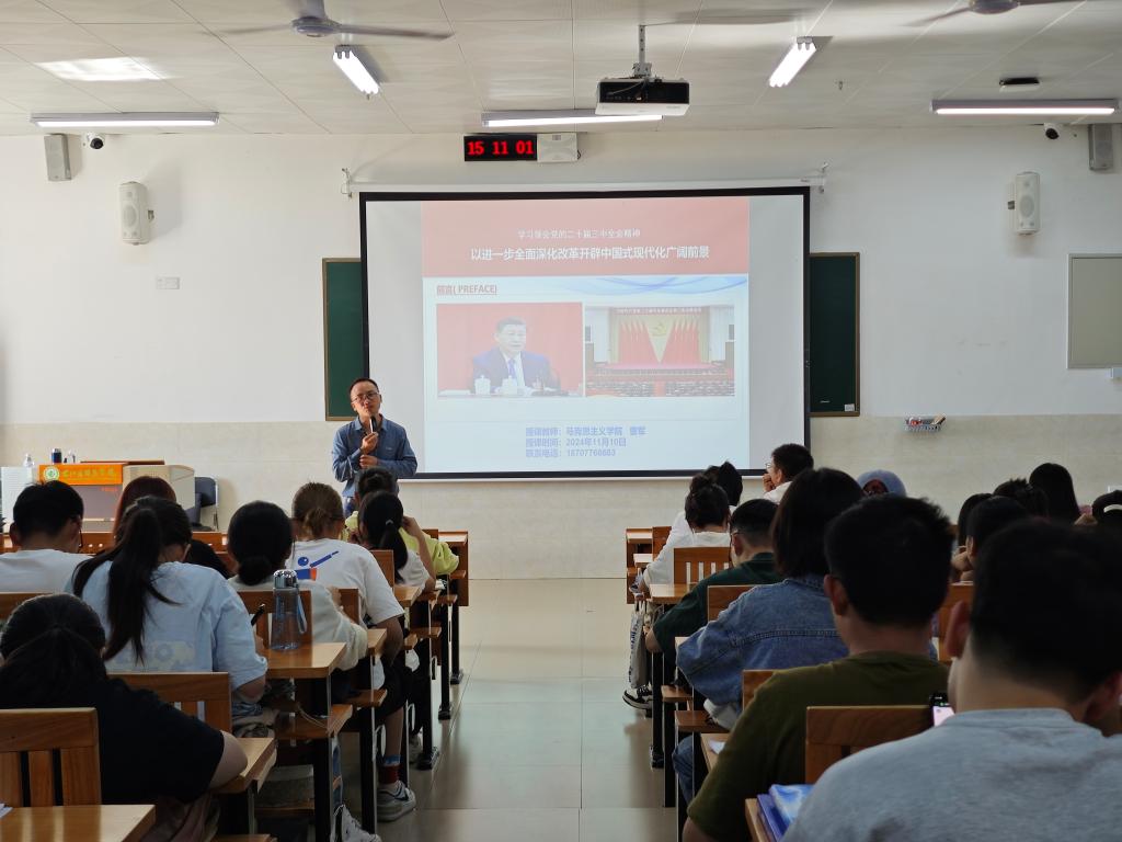 11月10日下午,由马克思主义公司曹军老师主讲《党的二十届三中全会精神》。曹老师紧扣党的二十届三中全会精神,结合国内外形势,深入浅出地阐述了全会的重大意义和深远影响。他强调,全会提出了一系列关乎国家长远发展的重大战略部署,为我们描绘了全面建设社会主义现代化国家的新蓝图,是指导当前和今后中国社会发展的重要纲领。曹军老师还呼吁同学们努力成为新时代合格的共产主义接班人,为构建和谐社会、推进国家治理体系和治理能力现代化作出更大贡献。
