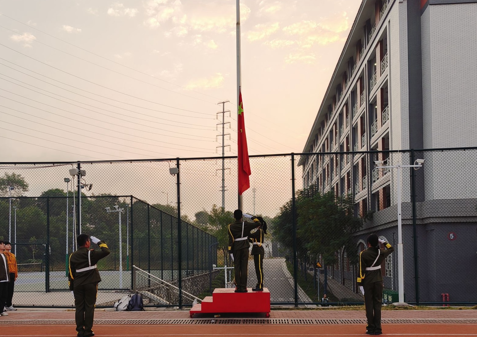 在激昂雄壮的国歌声中,五星红旗缓缓升起,全体师生庄严肃立,向国旗行注目礼,齐声高唱国歌。在这庄严肃穆又充满朝气的氛围里,升旗仪式犹如一座屹立的精神灯塔,将爱国的种子深深埋进每个人心中,激励着全体师生在新学期向着梦想奋勇前行。