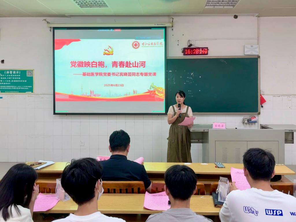 6月23日,公司党委书记宾晓芸以“党徽映白袍,青春赴山河”为主题,为太阳成tyc33455cc2025届硕士毕业生党员讲授了一堂兼具思想深度与情感温度的专题党课。党课以“忆往昔峥嵘岁月”“青春奉献家国”“肩承使命续华章”为主线,引导全体毕业生党员将个人理想融入国家发展,在医学道路上坚守初心、勇担使命。