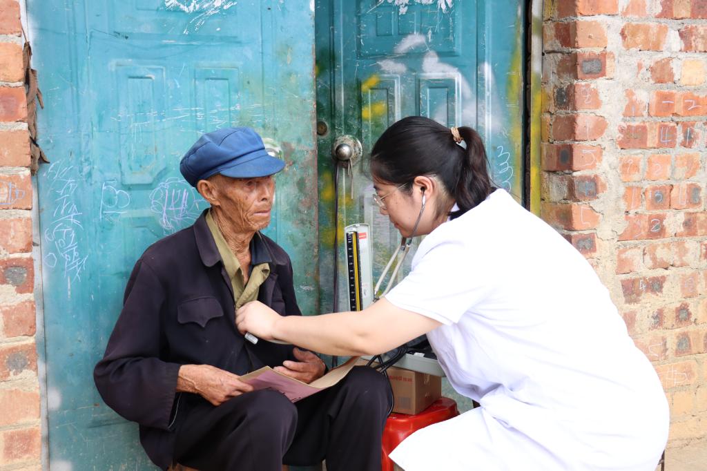 问诊环节里,医护专业的实践团成员拿出便携诊疗包,为老党员们测量血压、检查心肺功能,结合既往病史给出用药指导和膳食建议。“您这身体有点瘦,平时要少吃多餐。”“祝您身体健康。”,一句句细致叮嘱伴着血压计的滴答声,将健康守护的暖意送进老人心田。