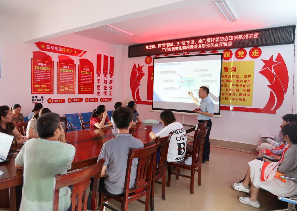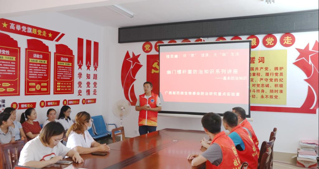 7月25日下午,团队到达西林县西平乡卫生院,进行了幽门螺杆菌防治系列的知识讲座,并播放了幽门螺杆菌防治知识的科普视频,对基层医生、护士等进行规范化诊疗培训,帮助他们认识到幽门螺杆菌感染及耐药的严重性。通过深入讲解一系列的防治方法,提高了基层卫生院规范化诊疗的水平和村民的生活质量,发挥了“闭环式”服务模式和团队各平台的作用。