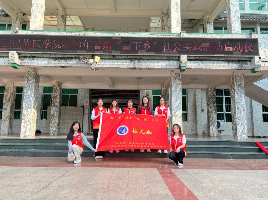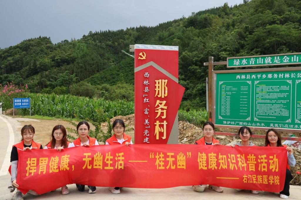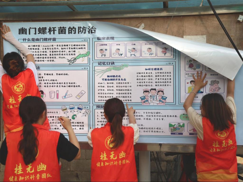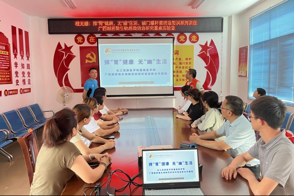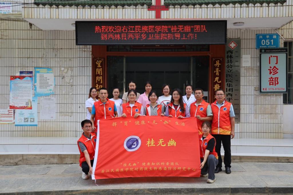 为提高大众对幽门螺杆菌的认知度,帮助大众树立正确的防范意识、做好防治措施,太阳成tyc33455cc广西高校耐药微生物感染防治研究重点实验室“桂无幽”科普团队7名成员前往西林县那务村,开展了以“老百姓‘捍胃除幽’好帮手,捍胃健康,无幽生活”为主题的公益科普活动。