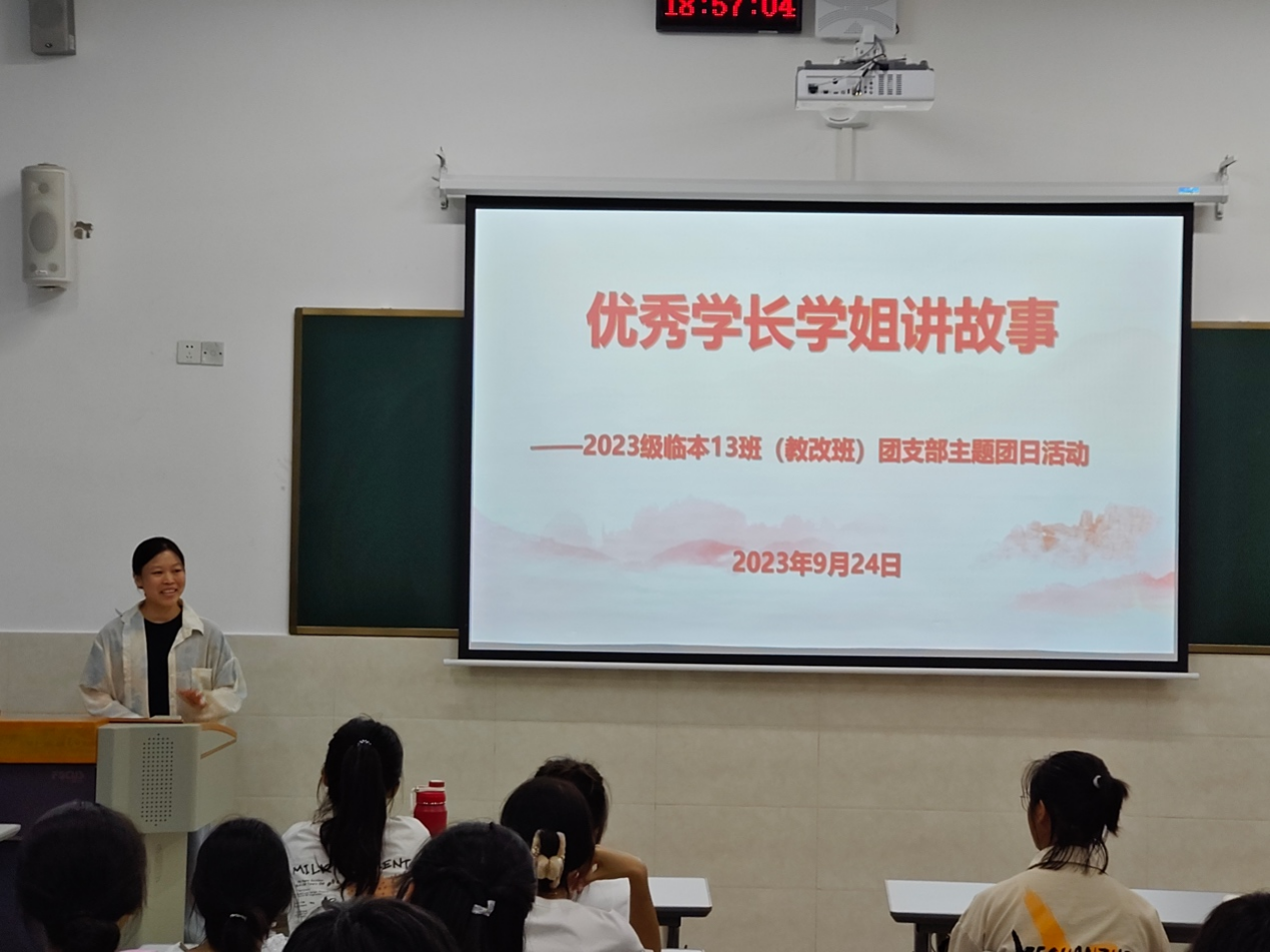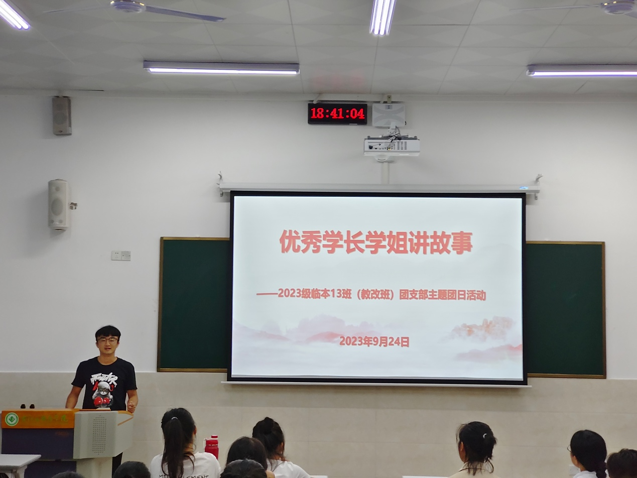 为使大一新生尽快适应大学的学习生活,增强同学们的自信心,激发同学们的学习热情,充分发挥榜样作用和做好传帮带作用,2023年9月24日晚上,2023级临床医学(教改班)邀请了公司正在实习的2019级临床医学(教改班)团支部书记韦文顺同学、党支部书记黄鸿同学到百东校区守正楼A403教室开展“优秀学长学姐讲故事”主题团日活动,2023级临床医学(教改班)全体同学参与了此次活动,活动由班长梁志阳同学主持。