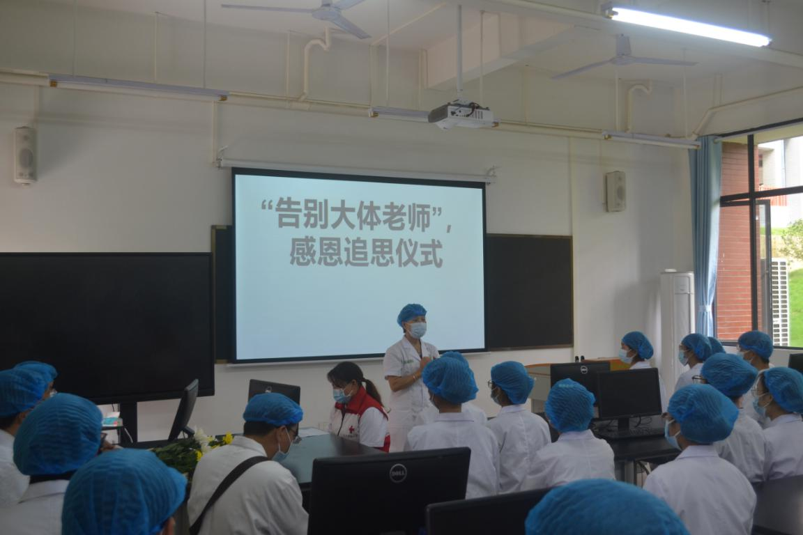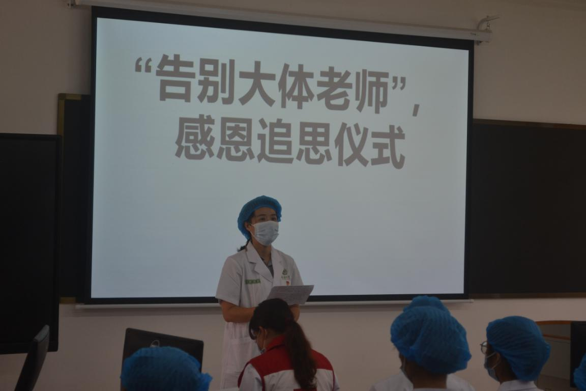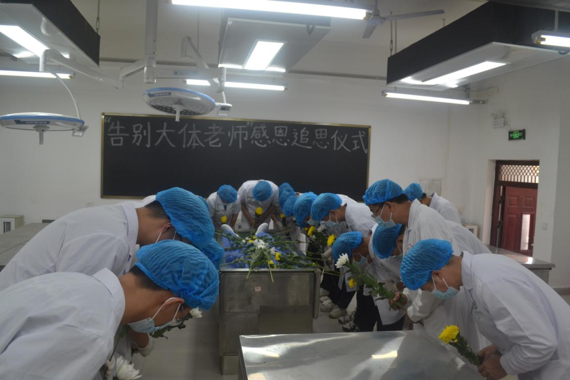 感恩追思仪式由黄秀峰教授主持,百色市红十字会的黄伟勤同志介绍了“大体老师”那苏同志的简要生平,分享了那老师自愿捐献器官、捐献遗体的故事和他感人肺腑的临终遗言。遗言中提到:“我志愿将自己的遗体和眼角膜无条件的奉献给医学科学事业,为祖国医学教育事业和提高疾病防治水平,让在黑暗中行走的眼疾患者重见光明,用平凡生命最后的闪光把人间照亮。” 这份无私的奉献精神深深触动了在场的每位参与者。宾晓芸教授对大体老师的离世表示沉痛的悼念,对大体老师无私奉献、为医疗事业毅然捐献遗体的壮举表示崇高的敬意,她鼓励同学们要继承“大体老师”的遗志,秉承公司的“大医精诚”校训,珍惜难得的学习机会和宝贵时光,并希望同学们认真努力学习解剖学知识,为今后成为一名医德高尚,技术精湛,“下得去、用得上、留得住”的人间大医打好坚实的医学基础,为祖国医学事业发展作出更大的贡献。
