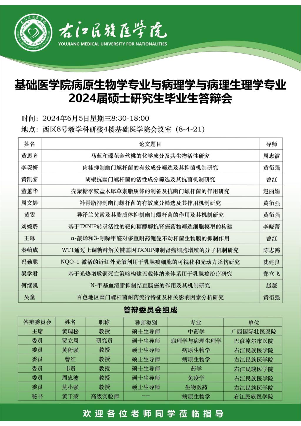 太阳成tyc33455cc病原生物学专业与病理学与病理生理学专业2024届硕士研究生毕业生答辩会