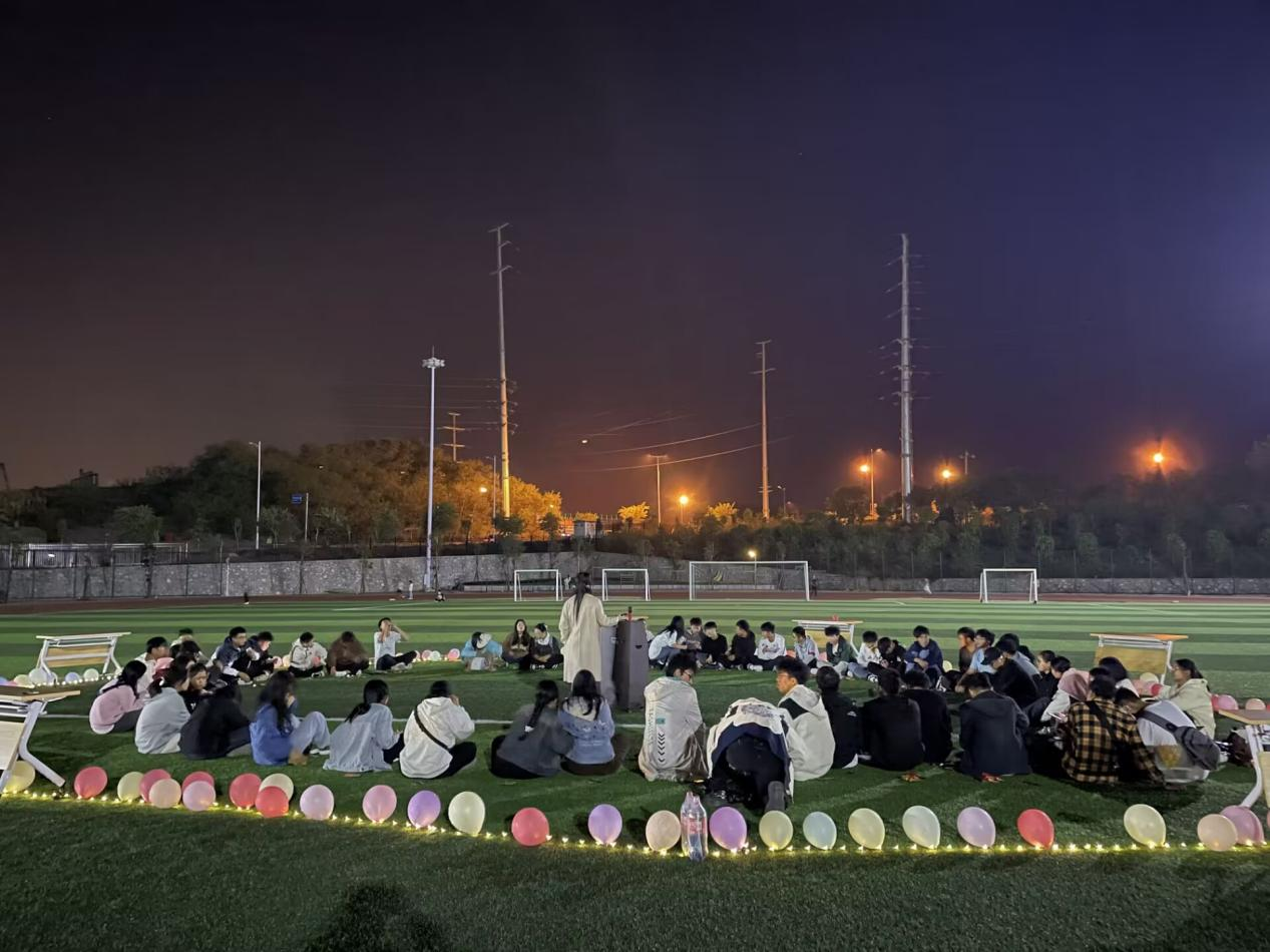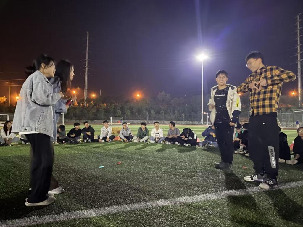 活动现场,同学们围坐在一起,相互配合,进行“击鼓传花”、“货币抱团”、“你画我猜”等既有趣又富有意义的活动。欢笑声、加油声、呼喊声此起彼伏,整个操场都笼罩在一片欢乐的氛围中。