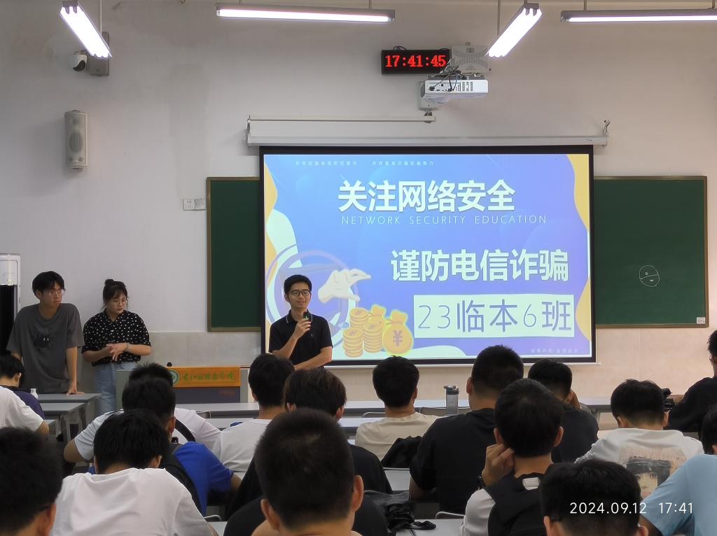 班会伊始,在集体观看了关于网络安全的宣传视频后,班长颜文涛从常见诈骗行为、电信诈骗的防范及处理措施两方面帮助同学们详细讲解了骗子的主要诈骗手段以及预防诈骗的基本办法。